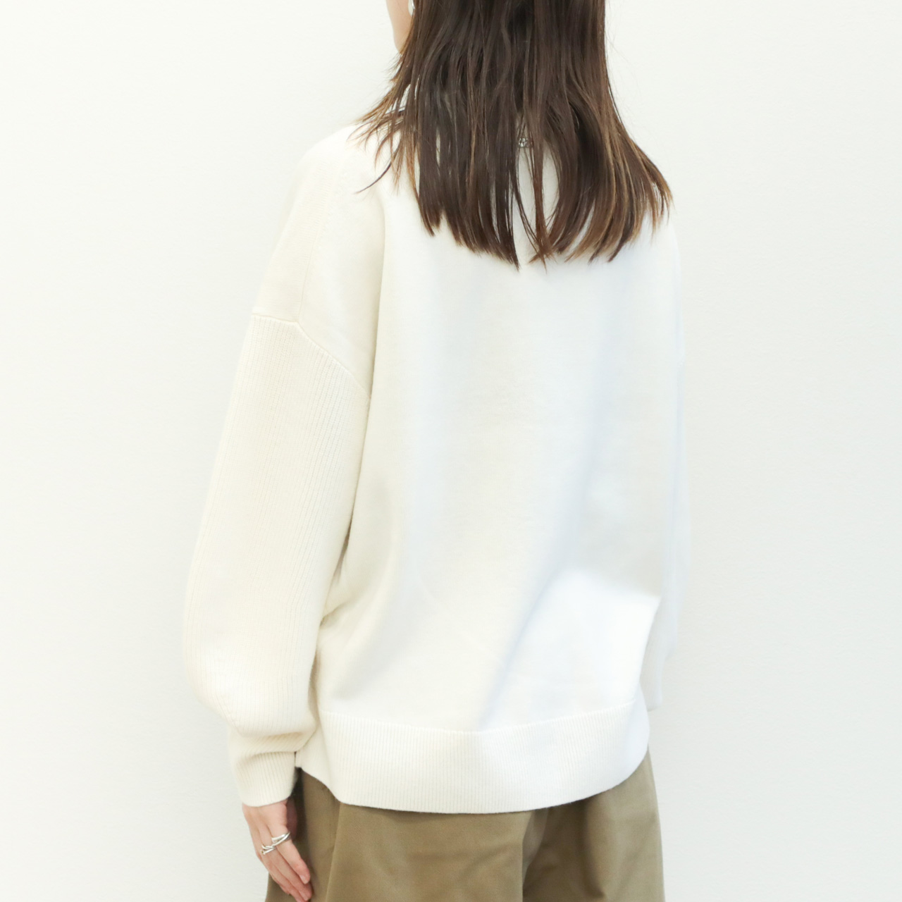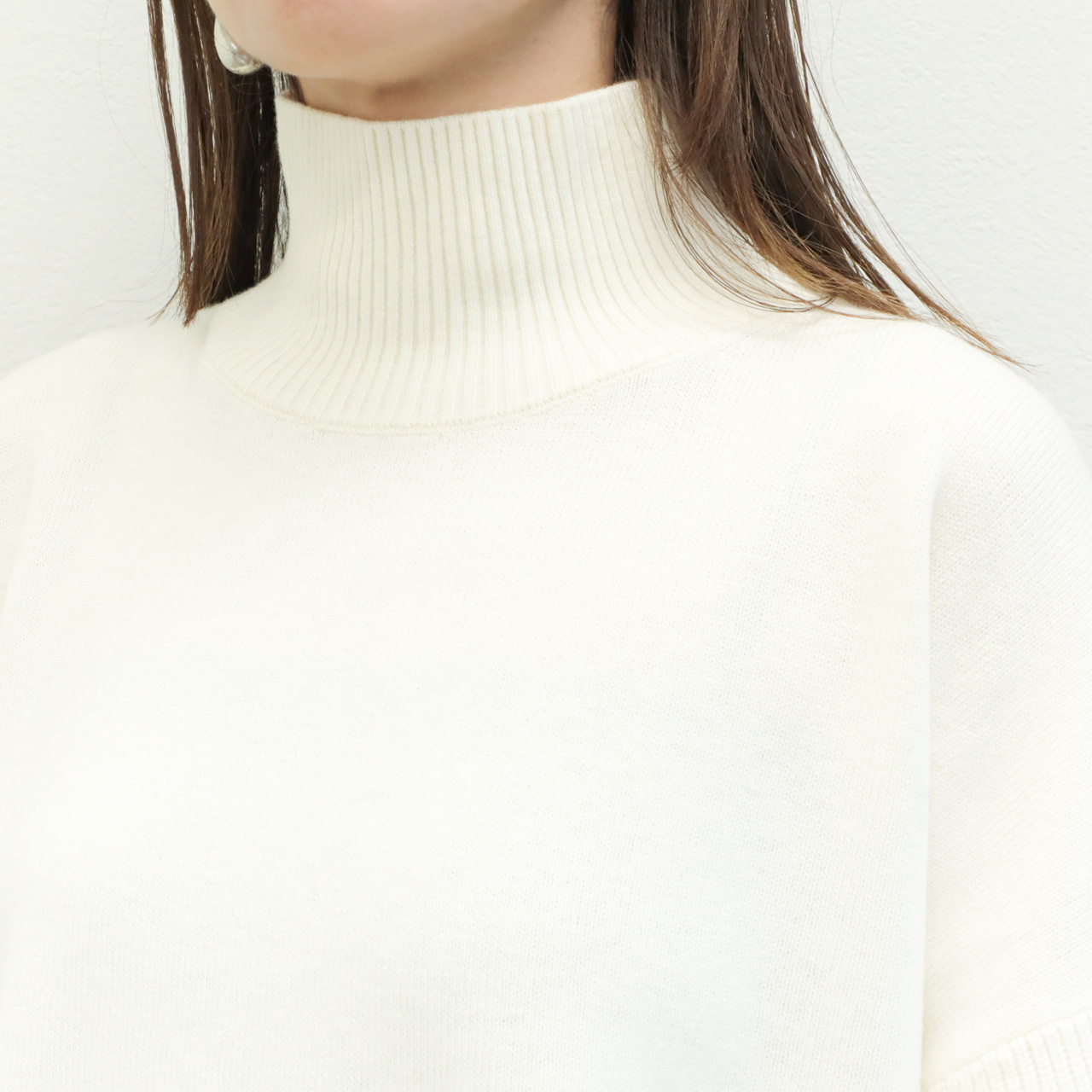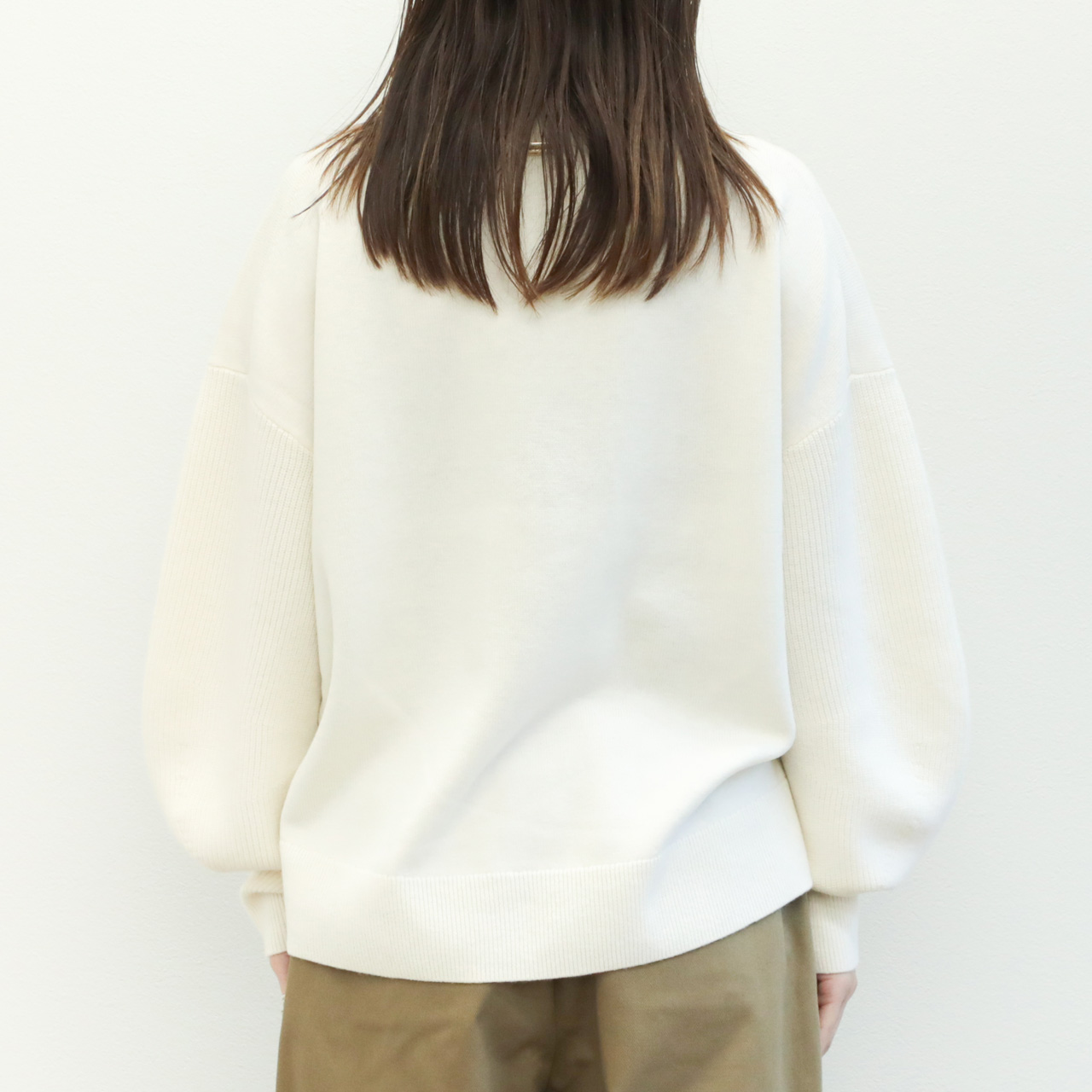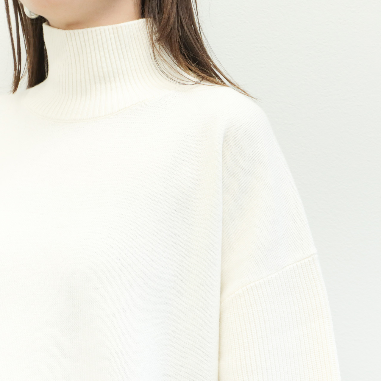 ベースはMICA&DEALの得意とする前後差をつけたボディラインを気にせず着られる程よくゆとりのあるシルエット。モックネック(ハイネック)を採用し、暖かさをキープ。更にユニークなのがスリーブのデザイン。