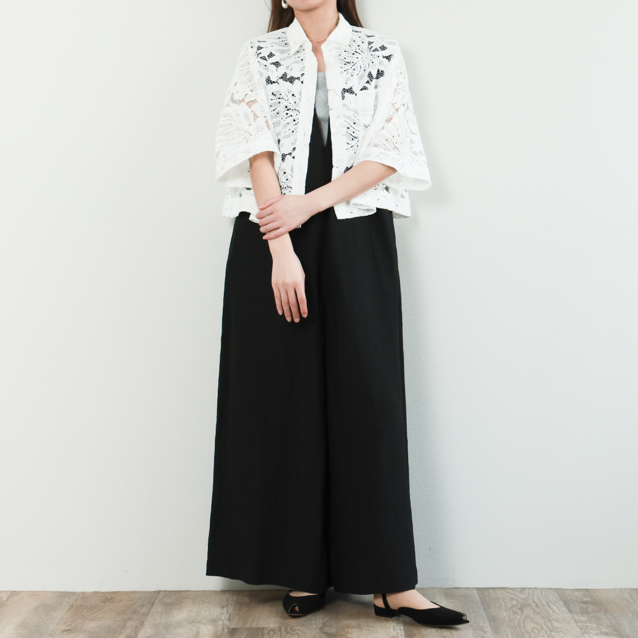 今までのレースアイテムにはないクラスカジュアル感が新しい。一枚着としてはもちろん、羽織りとして暑い時期まで長く活躍するシーズンムード高まる一着です。