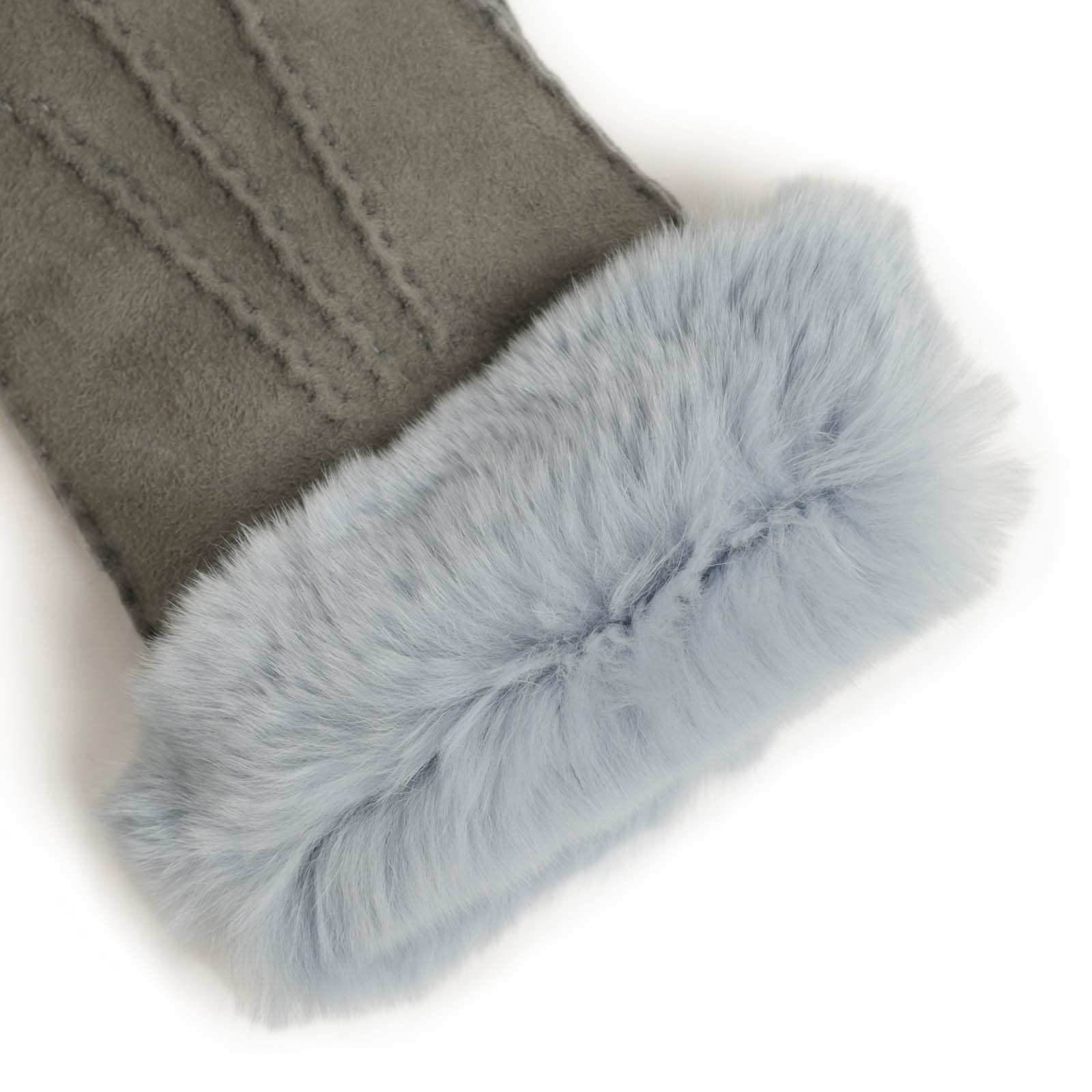 カラーはグレー、ファーがライトブルーのすっきりとした色合い。合わせる色合いを問いませんので、お手持ちのアイテムと合わせて様々なスタイリングをお楽しみいただけます。
