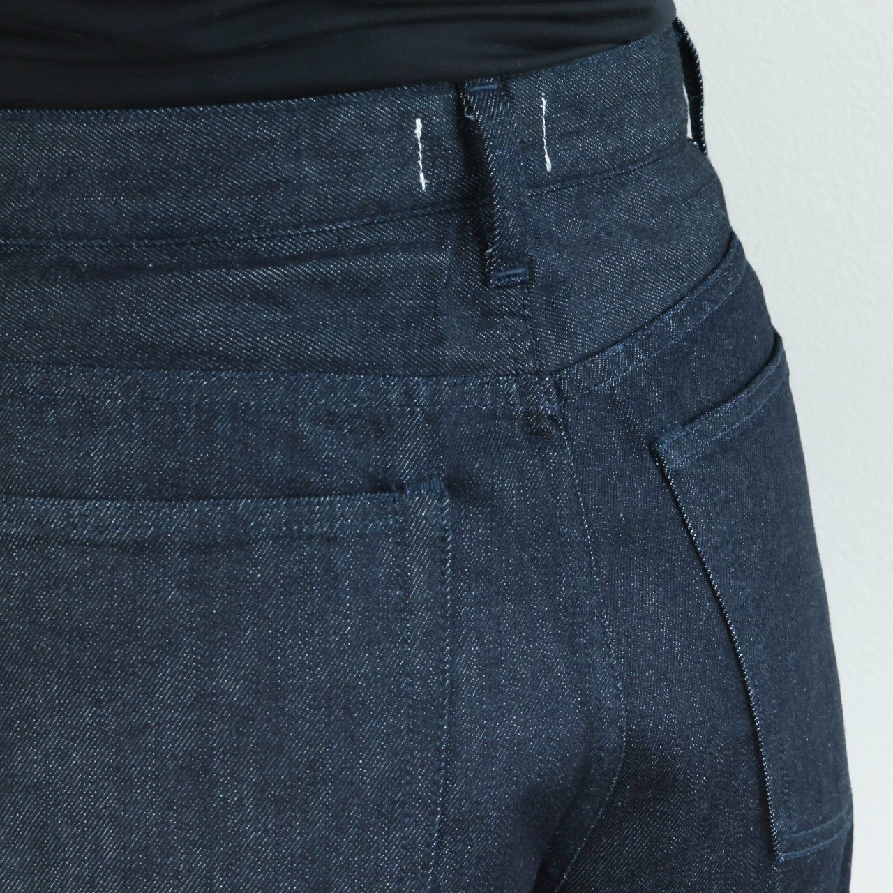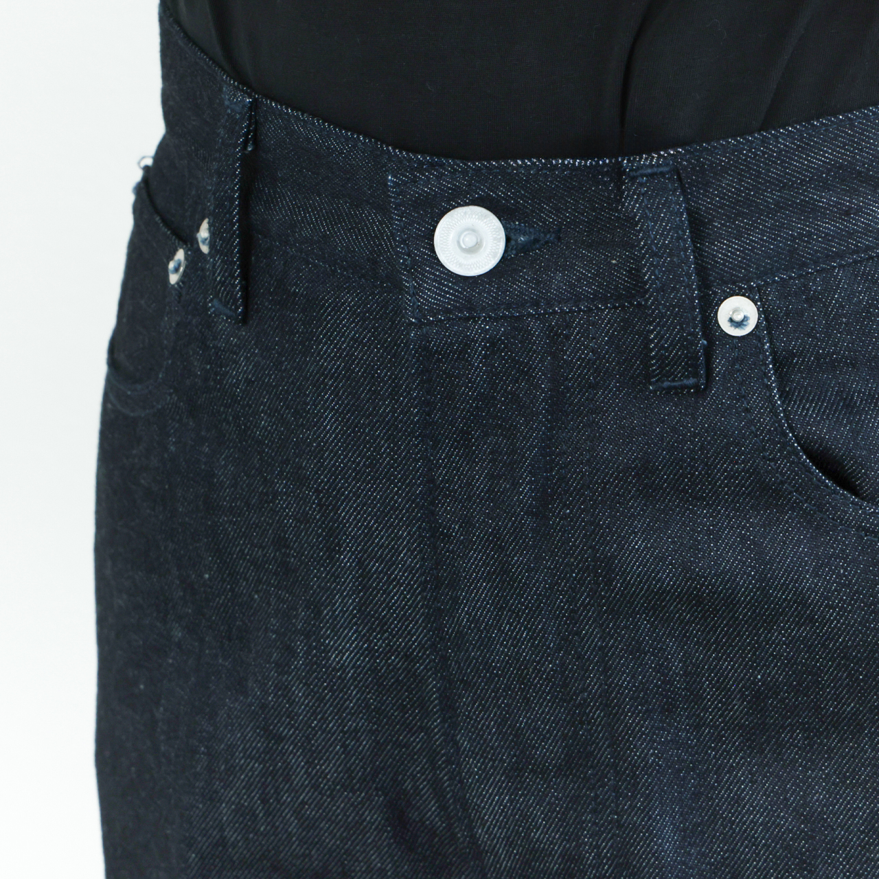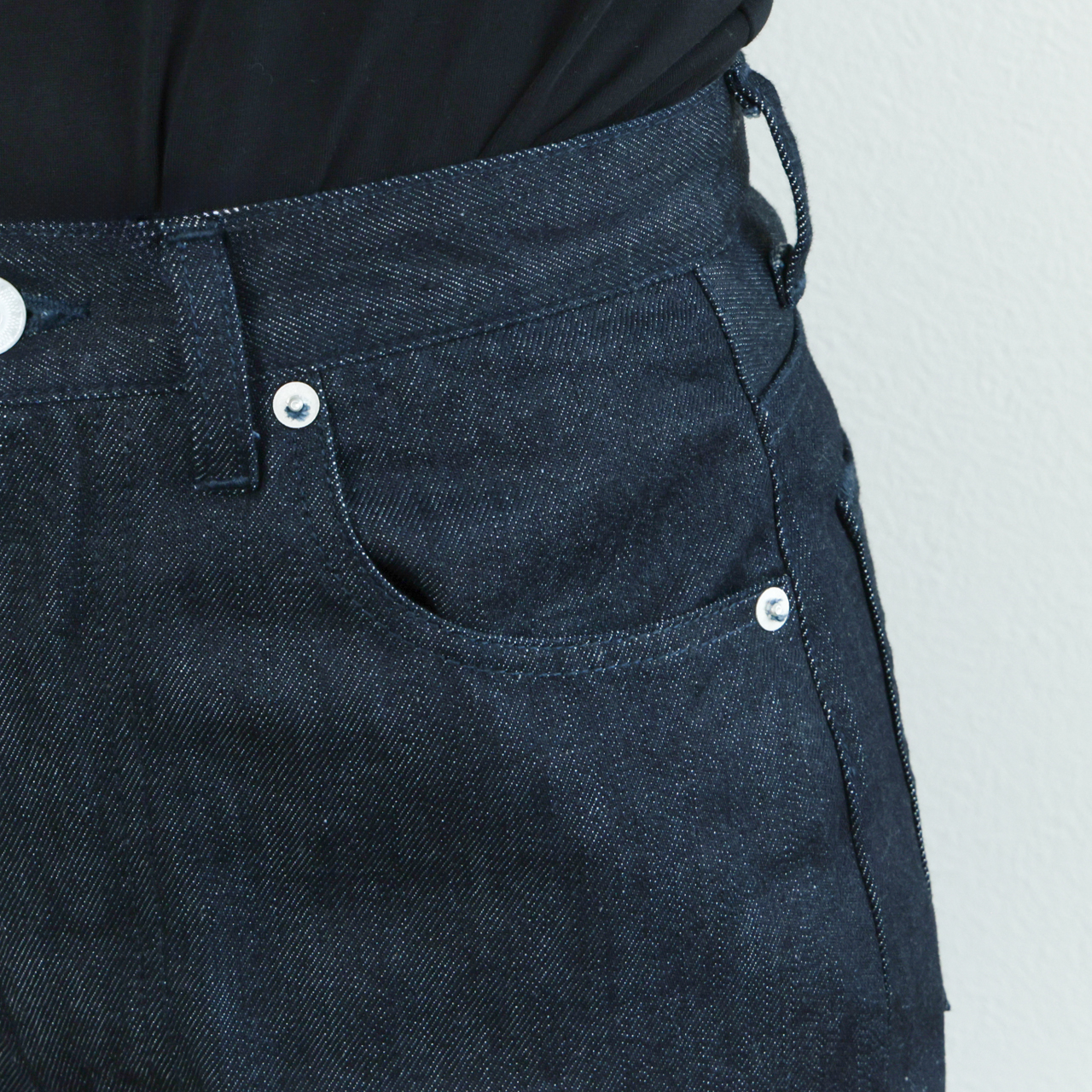 深みのあるRIGID BLUEカラーは大人の品の良さ、落ち着きを演出。着用を重ねるたびに生まれるアタリ、シワで育っていくデニムらしい表情の変化も楽しめる一本です。