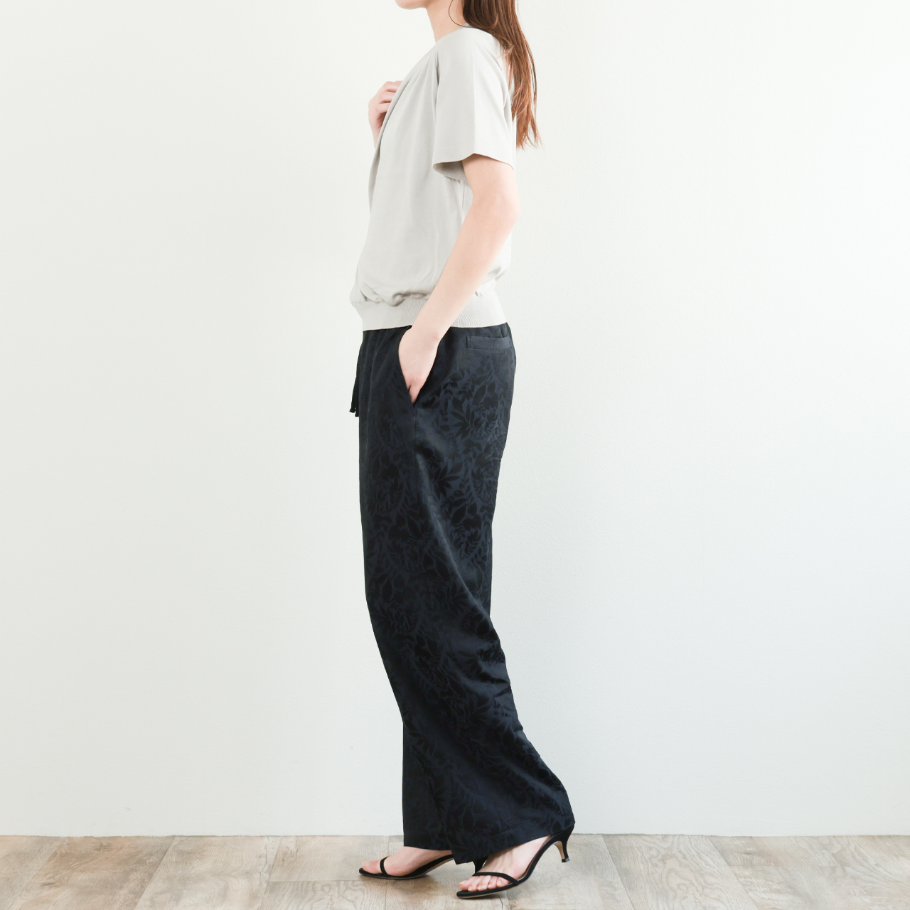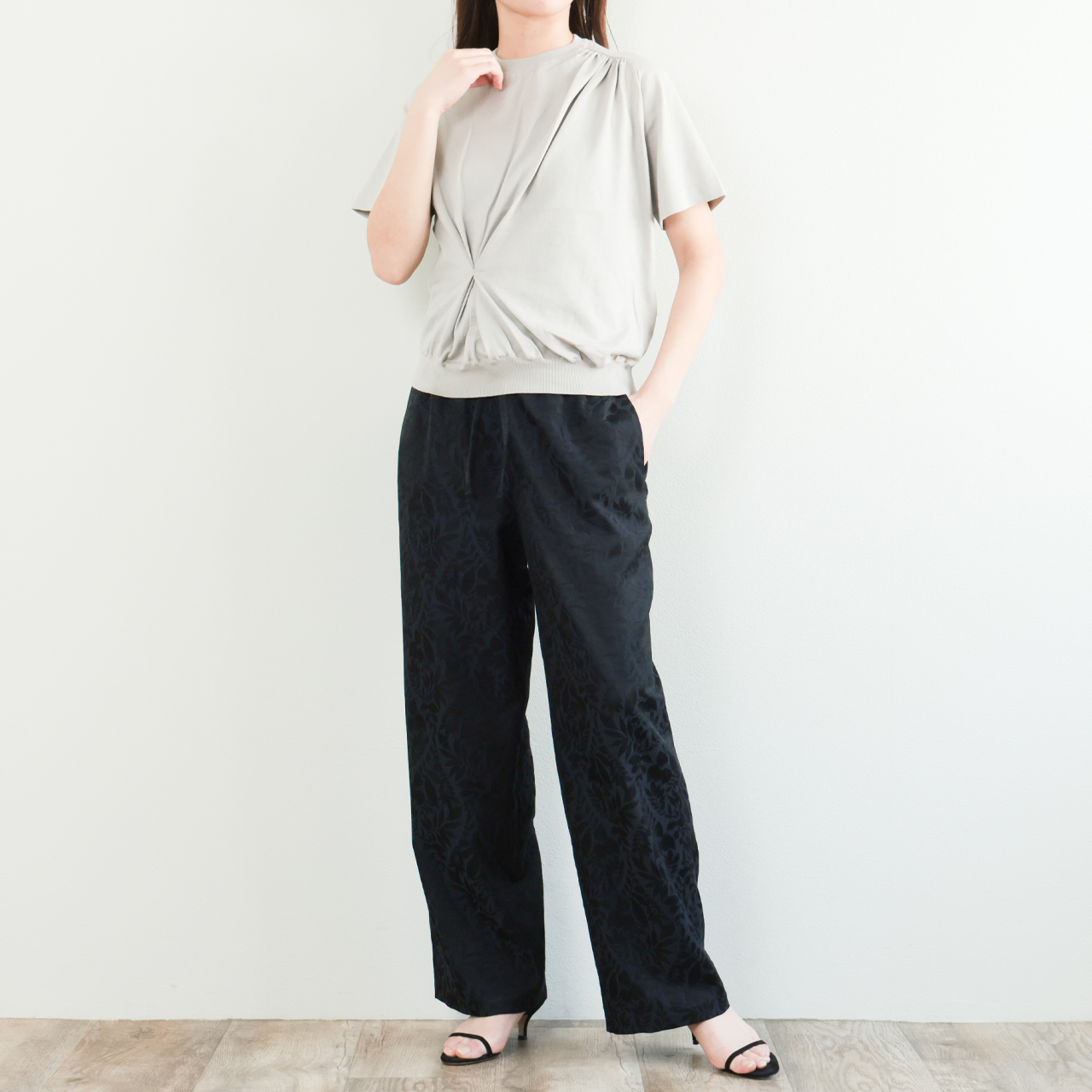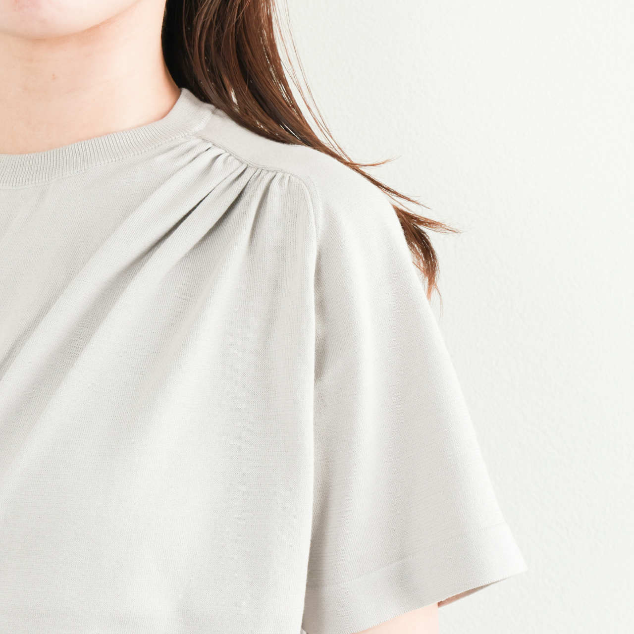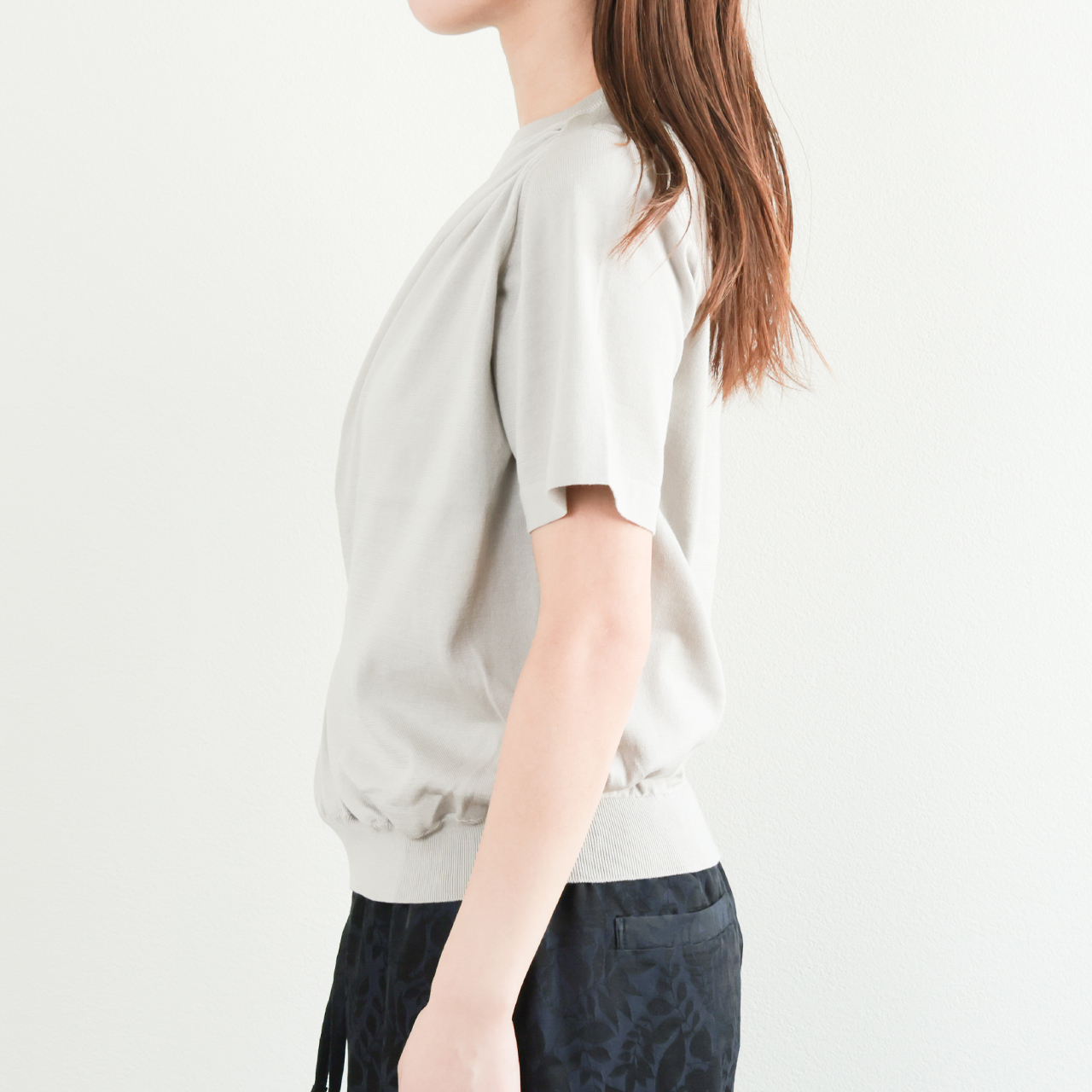 カラーはグレーをご用意。上質な素材感からくる気持ちのよい着心地と使いやすさを兼ね備えた一着。