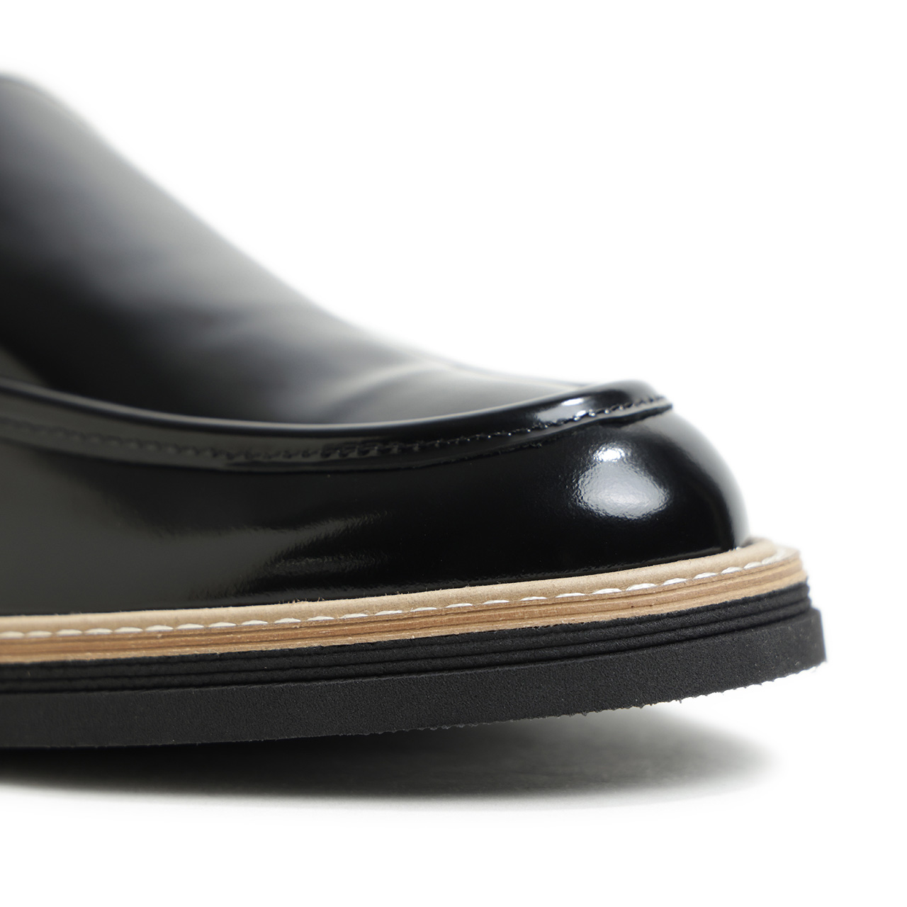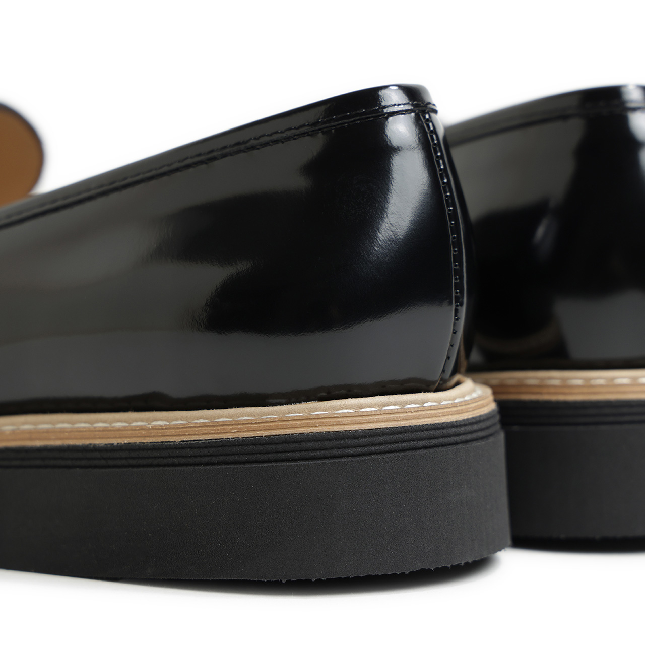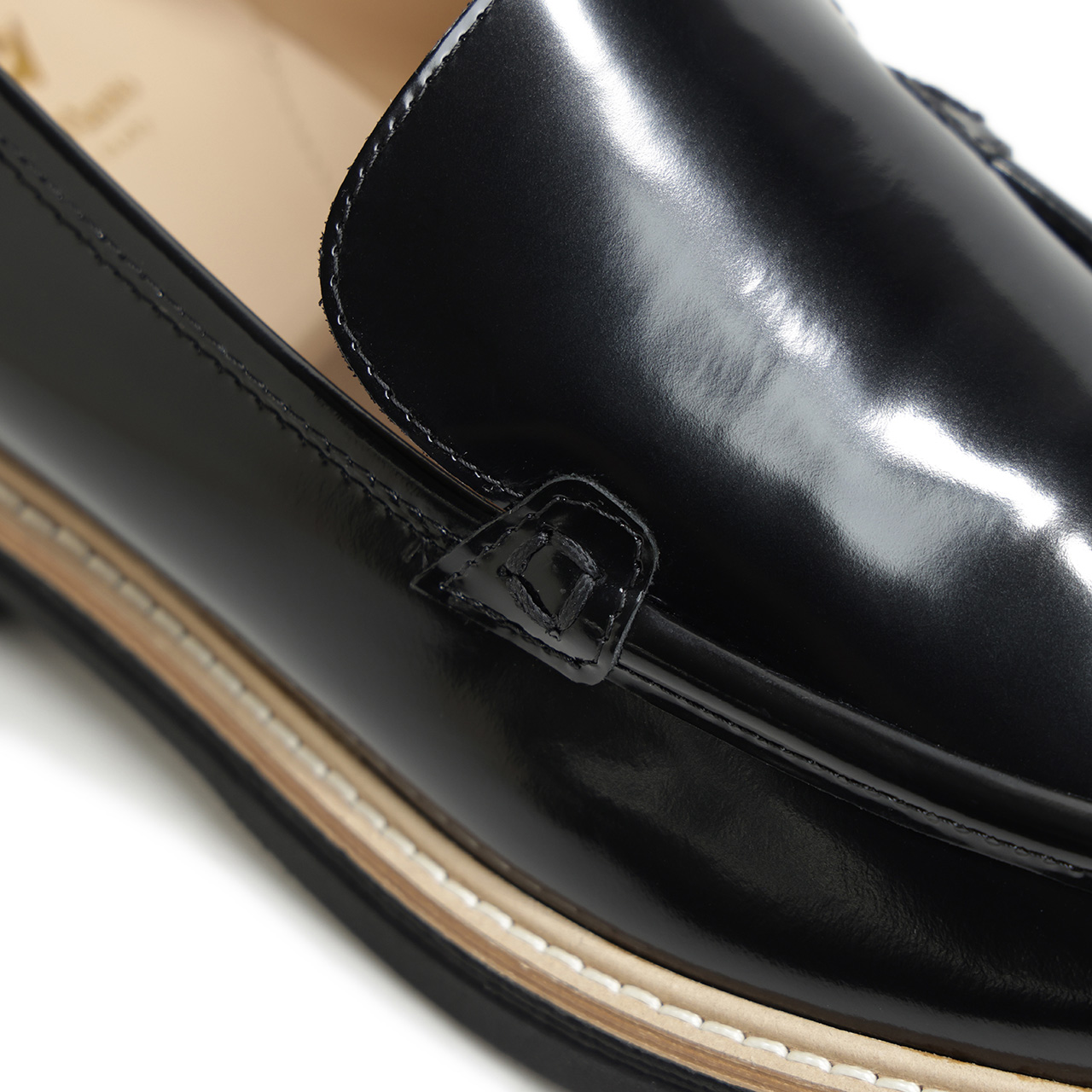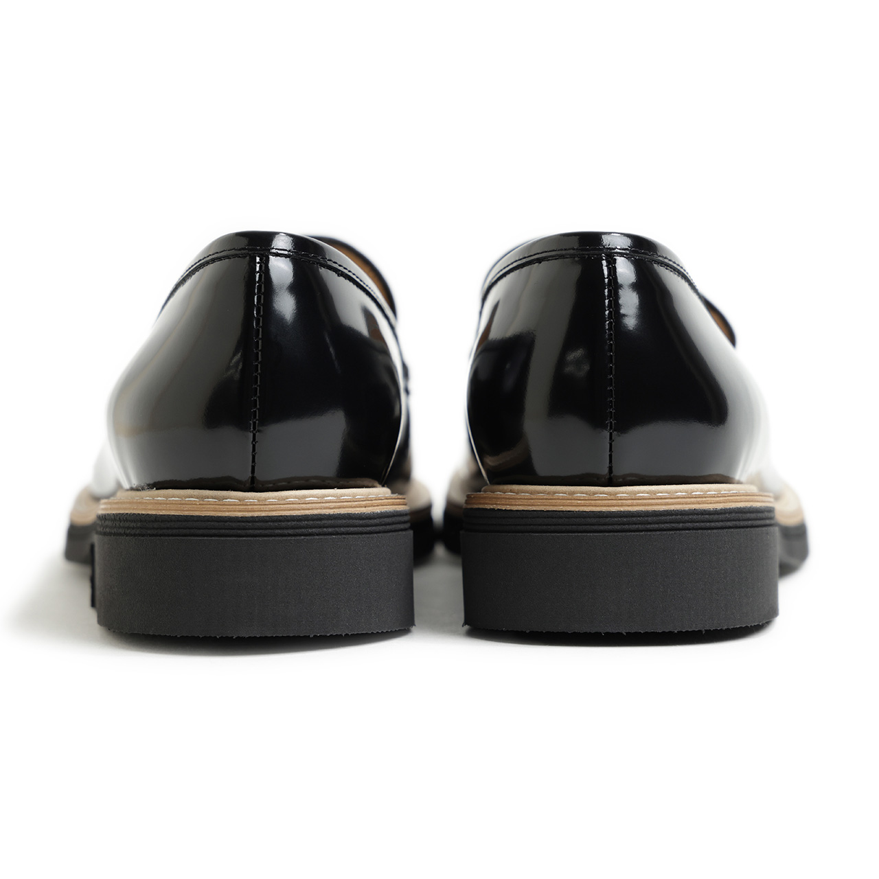 モカ部分は内側のステッチが出ない形で縫い合わせ、被せのデザインに。U字の内側のステッチがない分ミニマルな印象があり、きれいめなスタイルにもはまりそうな一足となっております。