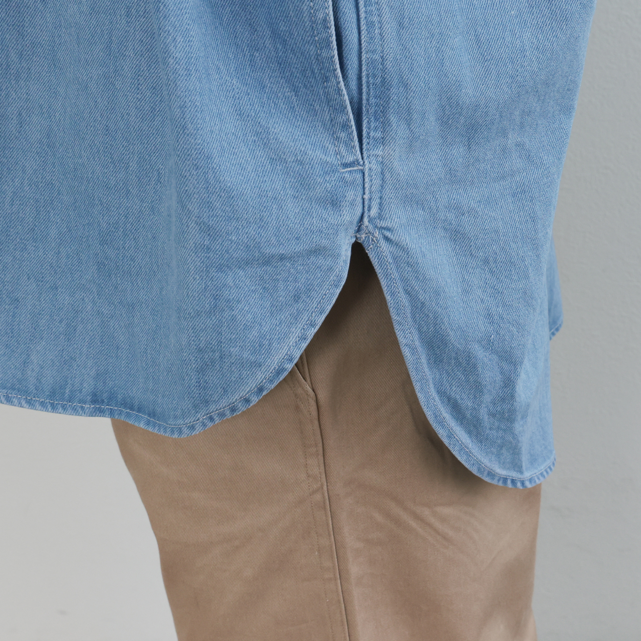 リヨセル・アセテートを使用したことで品のある光沢、軋み感があるサックス、コットン100%のカーキ、それぞれに良さがあり、見え方も異なるため是非一度袖を通していただいて表情を確認していただきたいところです。