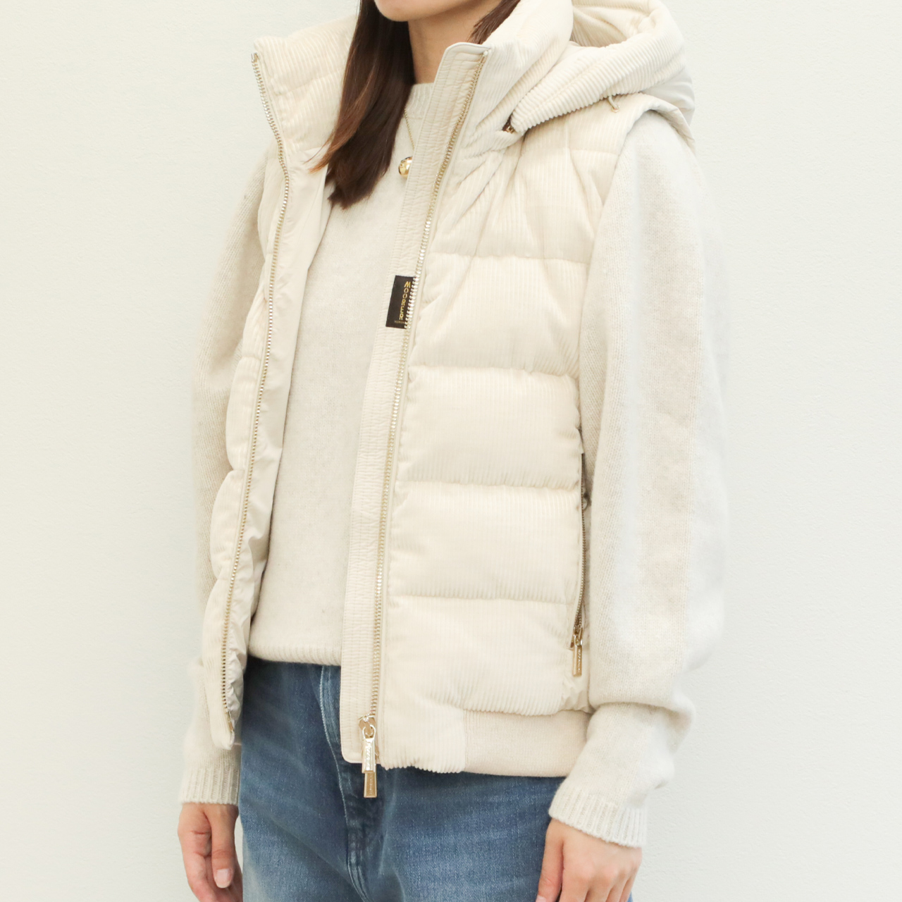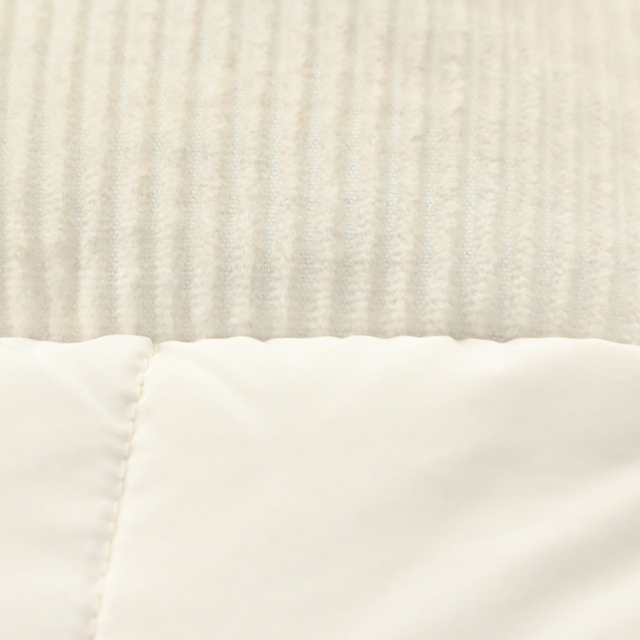 こちらの「LAYRE」はコーデュロイ生地をベースに、ナイロンポリウレタンの生地で切り替えた異素材使いと、リブ使いが光る一着。