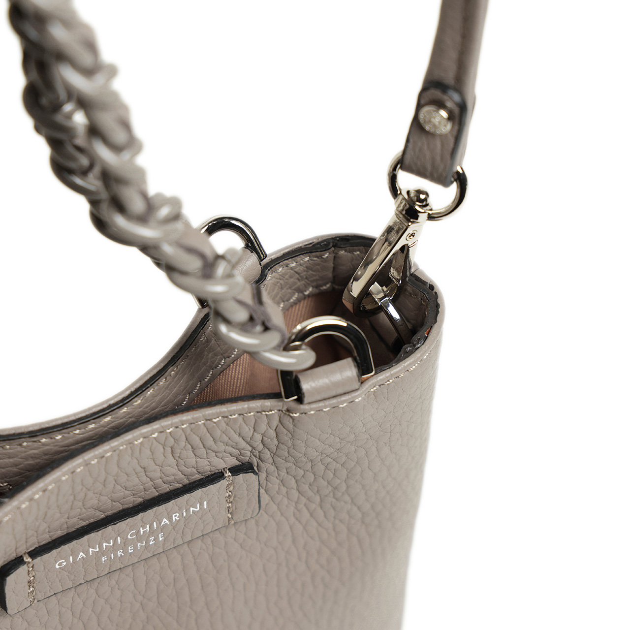 2WAY仕様になっており、チェーンとレザーの組み合わせになったハンドルなどさりげないアクセントが光ります。