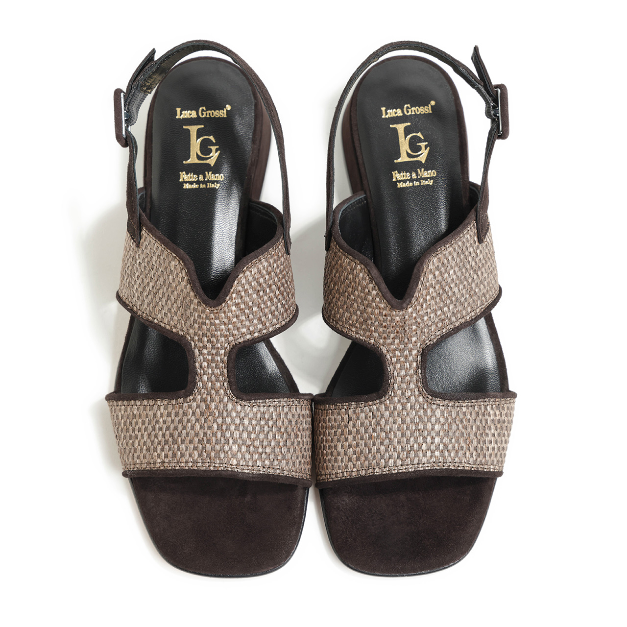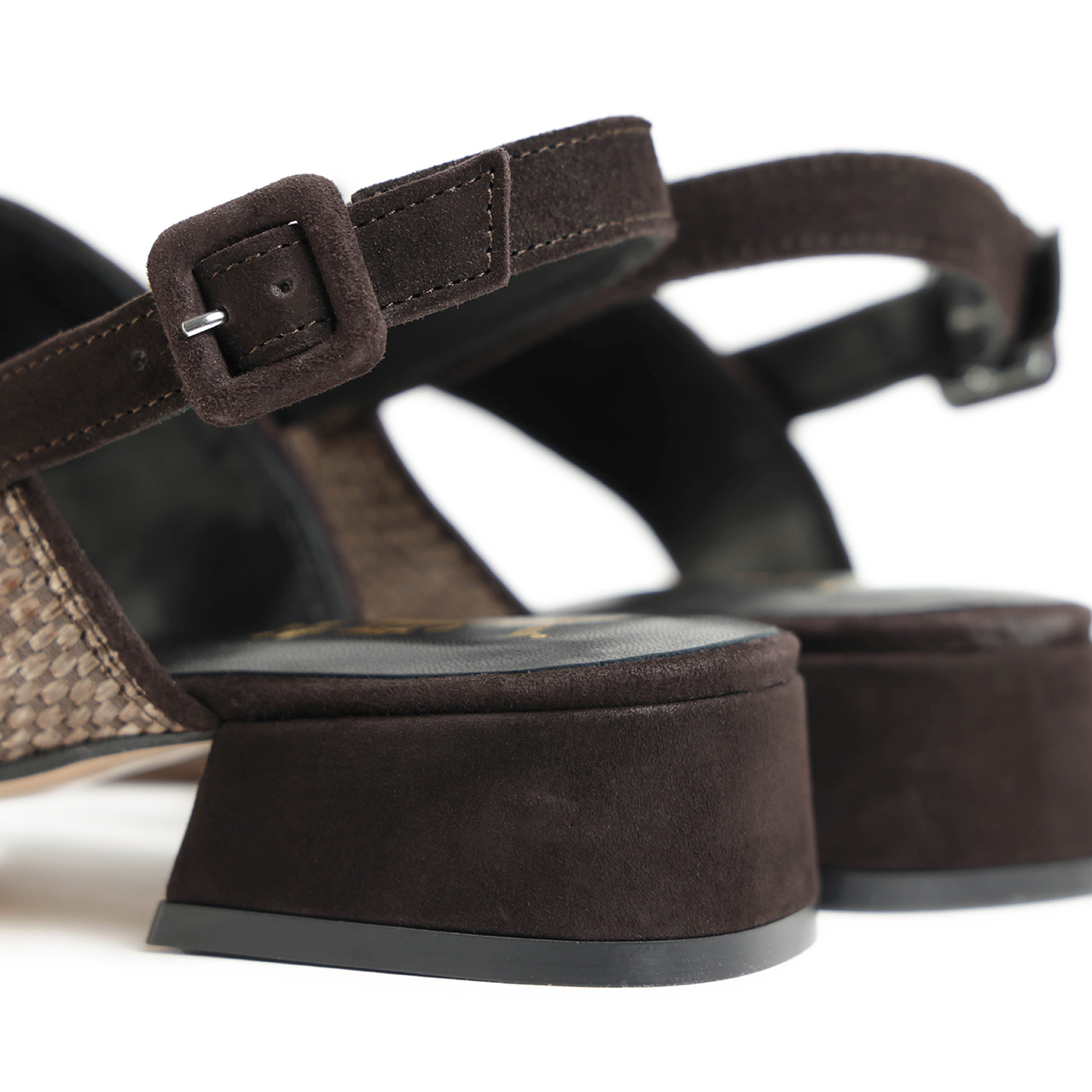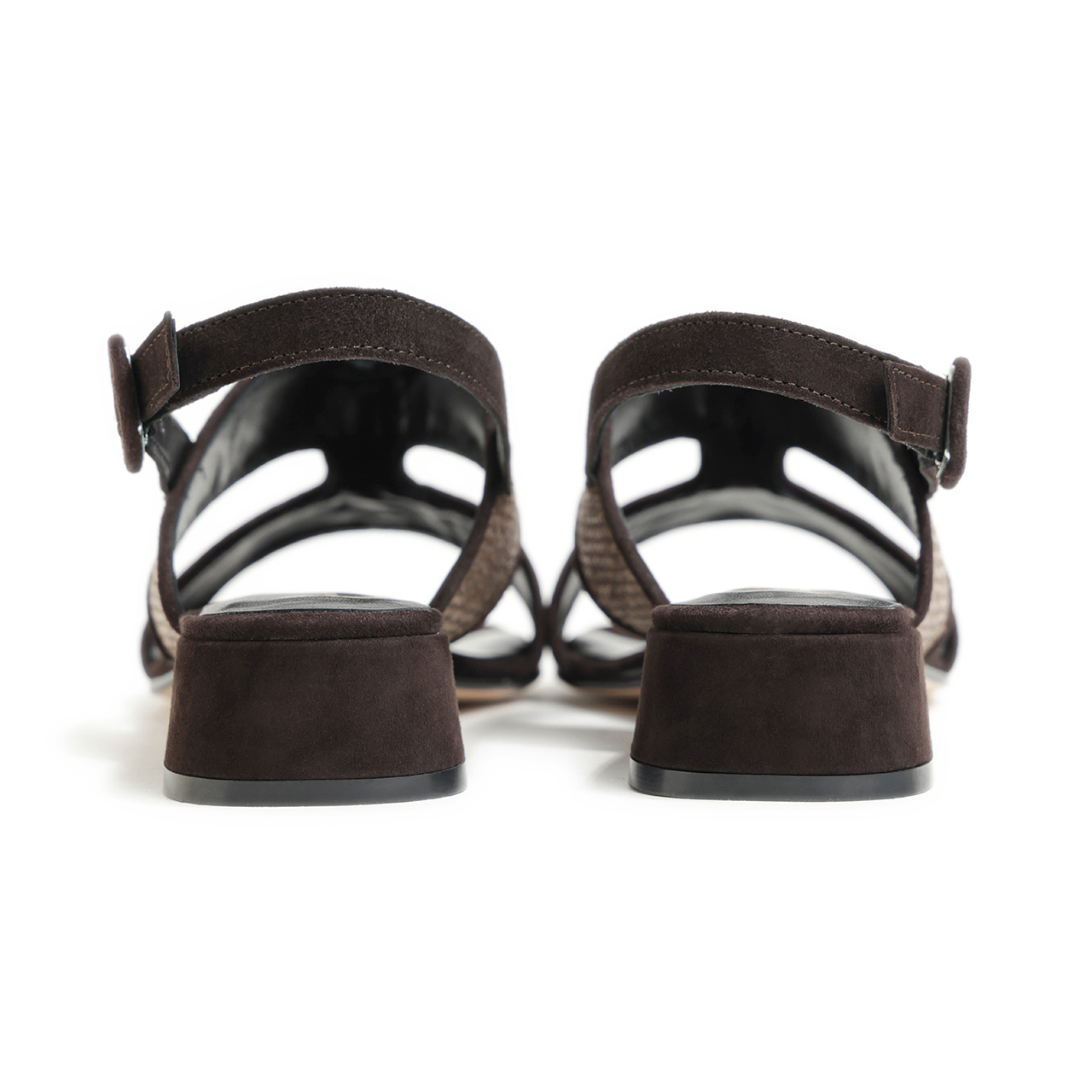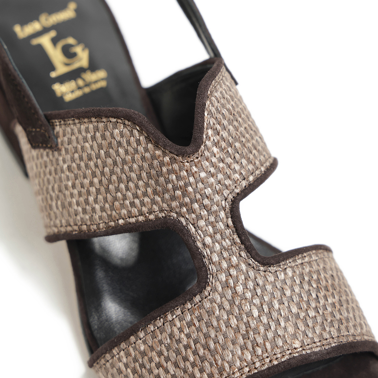 ストラップやパイピングにはソフトできめ細かく、しっとりとした毛足短めのスエードをアッパーに使用。マットな素材感が足元に大人の女性に品の良さを与えます。フットベッド部分もスエードを使用しラフィア素材が引き立つ素材のコンビネーションに。