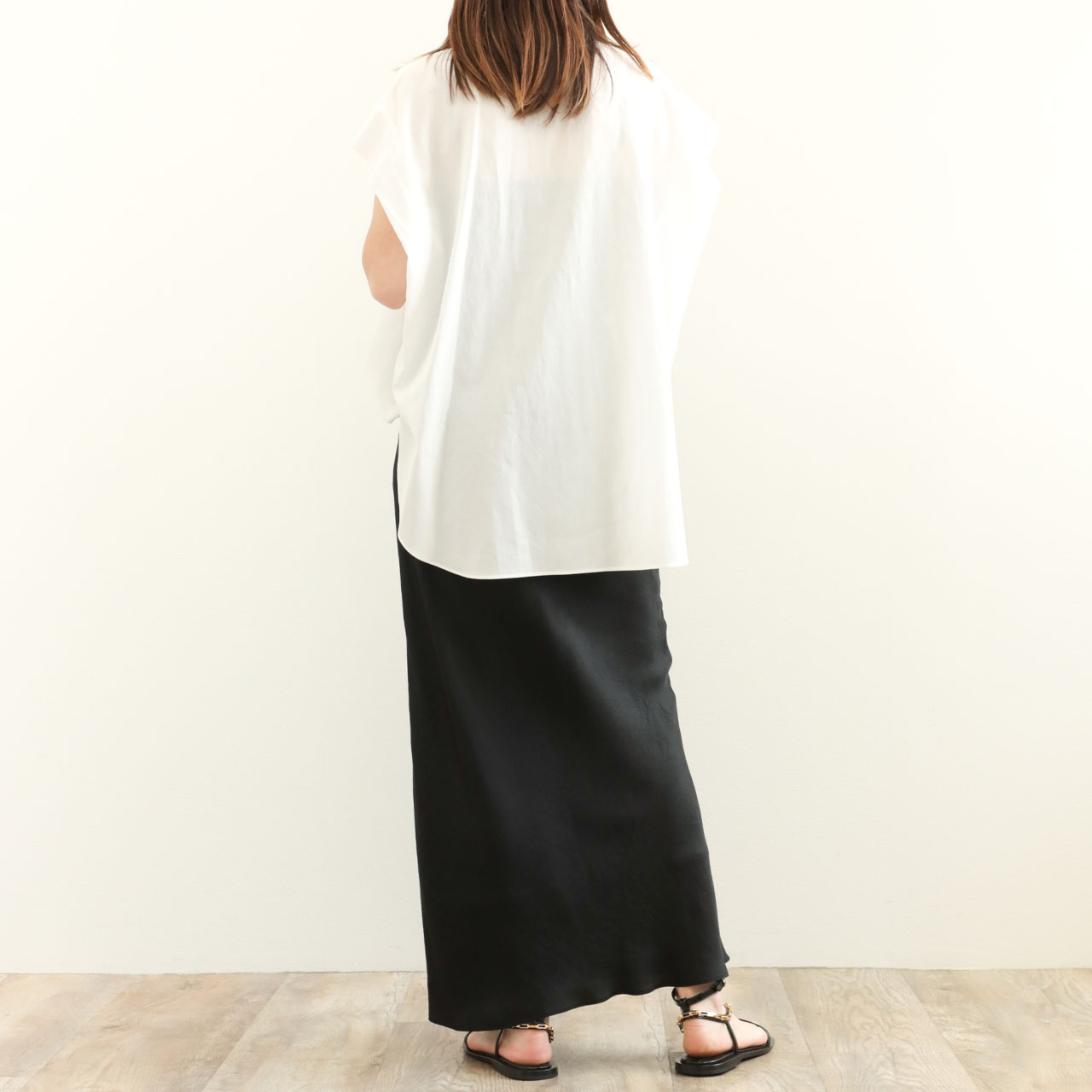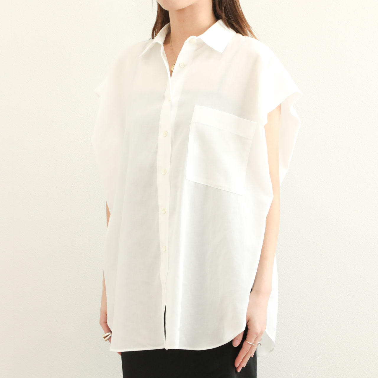 肌にまとわりつかず、さらりとしたドライタッチが魅力の一枚は、汗ばむ季節にも心地よく着用できる清涼感のある素材感が特徴です。