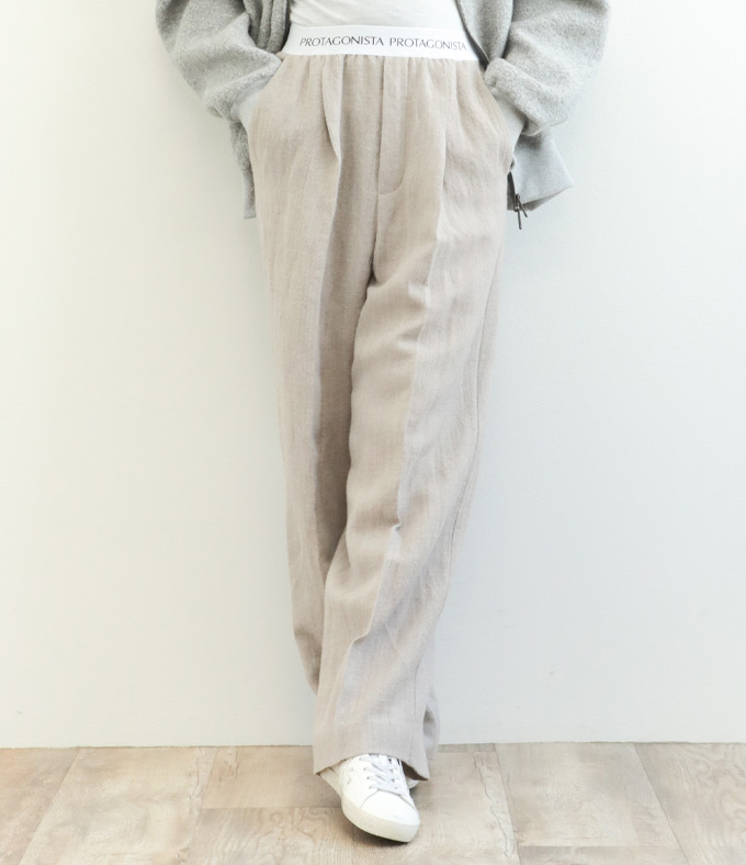 PROTAGONISTA プロタゴニスタ レディース パンツ スラックス ウール リネン ワイド プリーツ ウエストロゴ PNT-PT-12 GREIGE/グレージュ