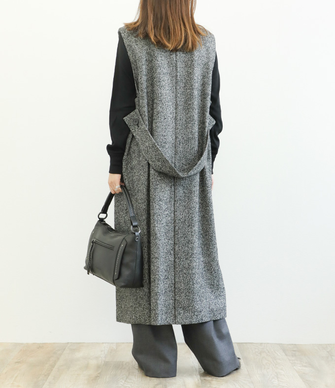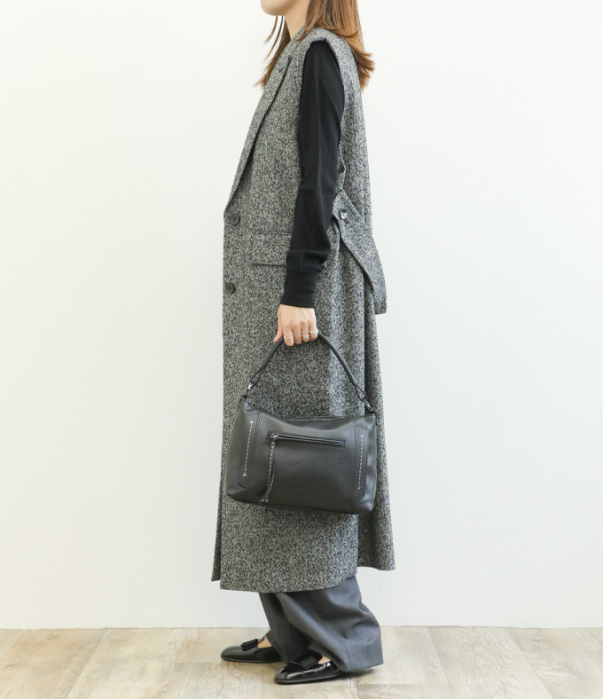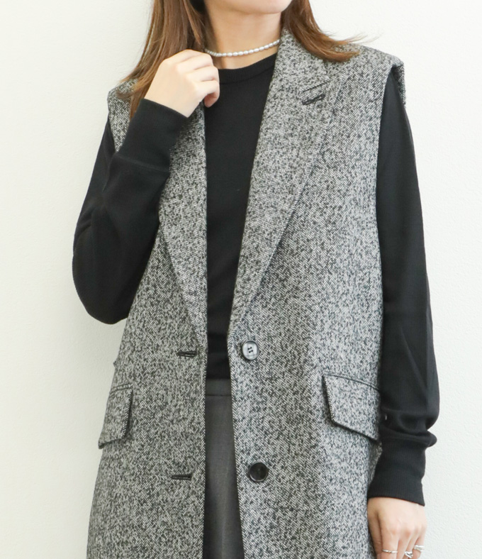 SACRA サクラ レディース ベスト ジレ ウール ポリエステル アクリル ナイロン ロング丈 ピークドラペル PREMIUM HERRINGBONE TWEED GILET 125501062 BLACK/ブラック