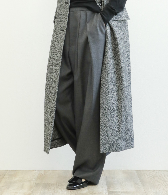 SACRA サクラ パンツ ワイド ウール ポリエステル アクリル ナイロン ヘリンボーン 2プリーツ 尾錠付き テーパード PREMIUM HERRINGBONE TWEED PANTS 125501113 BLACK/ブラック