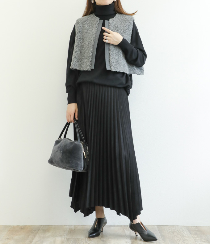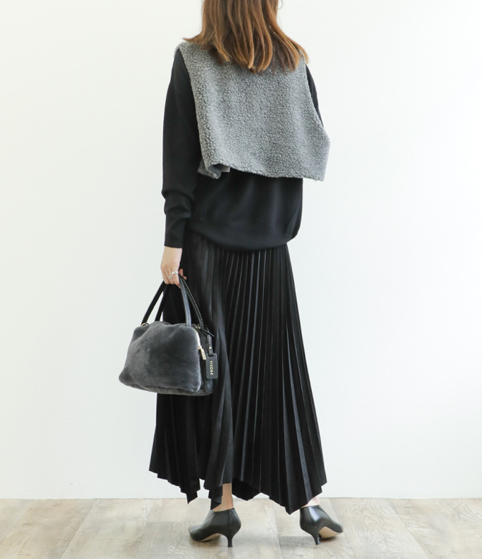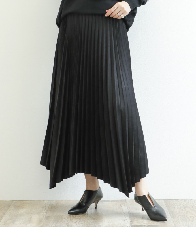 SACRA サクラ スカート ロング プリーツ ランダムヘム マキシ丈 フェイクスエード 合成皮革 SYNTHETIC SUEDE PLEATS SKIRT 125523121 BLACK/ブラック