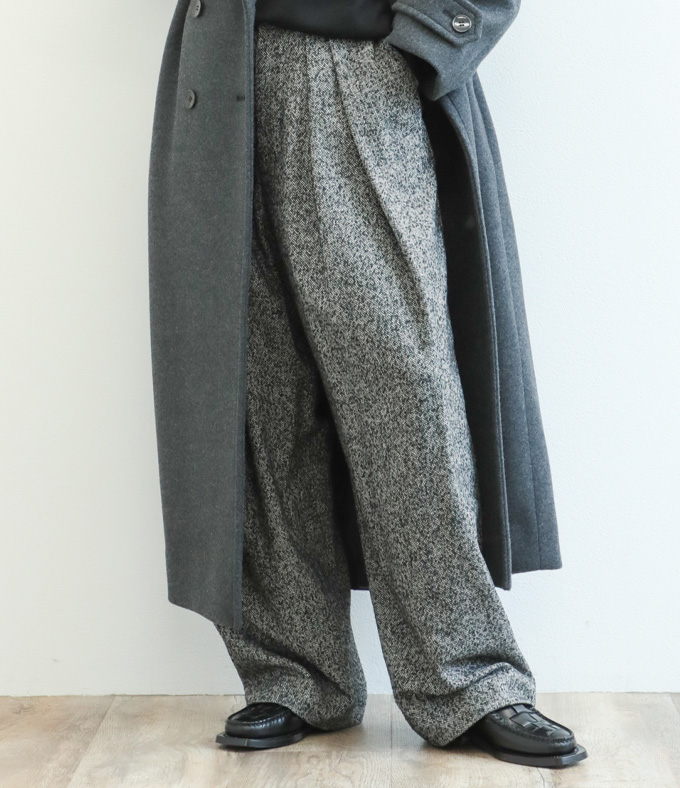 SACRA サクラ パンツ ワイド ウール ポリエステル アクリル ナイロン ヘリンボーン 2プリーツ 尾錠付き テーパード PREMIUM HERRINGBONE TWEED PANTS 125501113 BLACK/ブラック