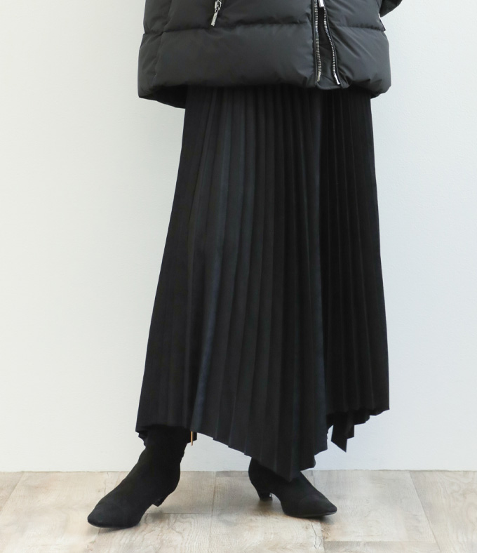 SACRA サクラ スカート ロング プリーツ ランダムヘム マキシ丈 フェイクスエード 合成皮革 SYNTHETIC SUEDE PLEATS SKIRT 125523121 BLACK/ブラック